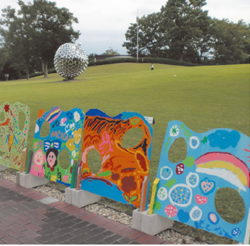 7月11日に貢川小学校で開催された、三世代ふれあい教室で描かれた作品の屋外展示です。家族で描いた、元気あふれる板絵作品が並びます。